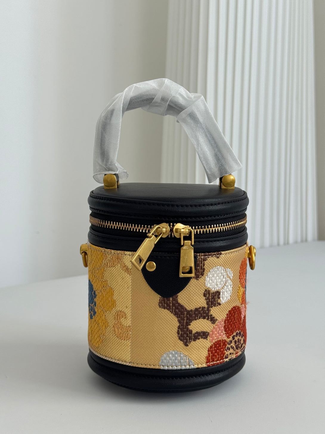 Drawing inspiration from vintage vanity cases and Arabian elegance, this Jamila Bucket Bag reinterprets the classic bucket silhouette with Eastern silk artistry. The bold black leather frame contrasts beautifully with shimmering gold and ivory silk embroidery, symbolizing strength and grace. The structured form and refined metal accents make it both an art object and a fashion statement.