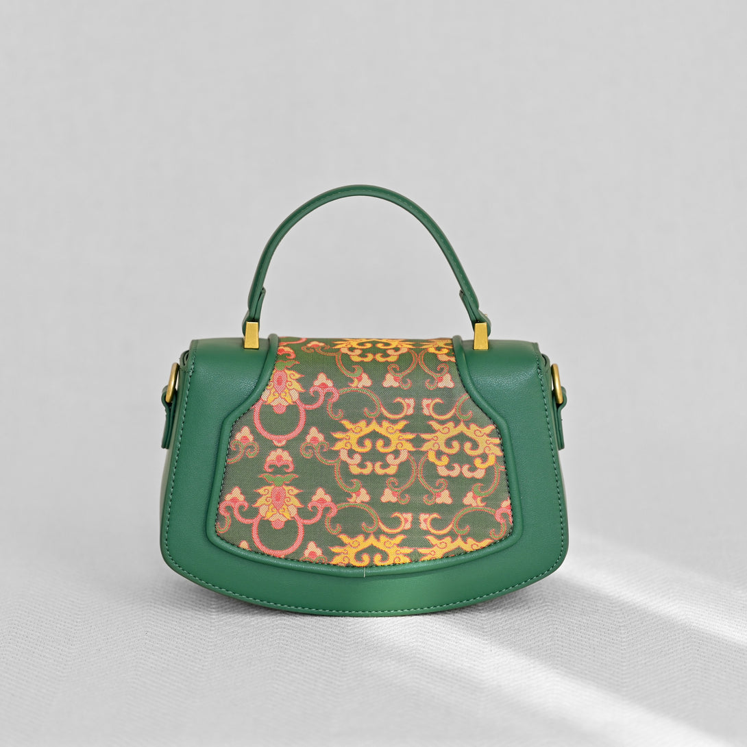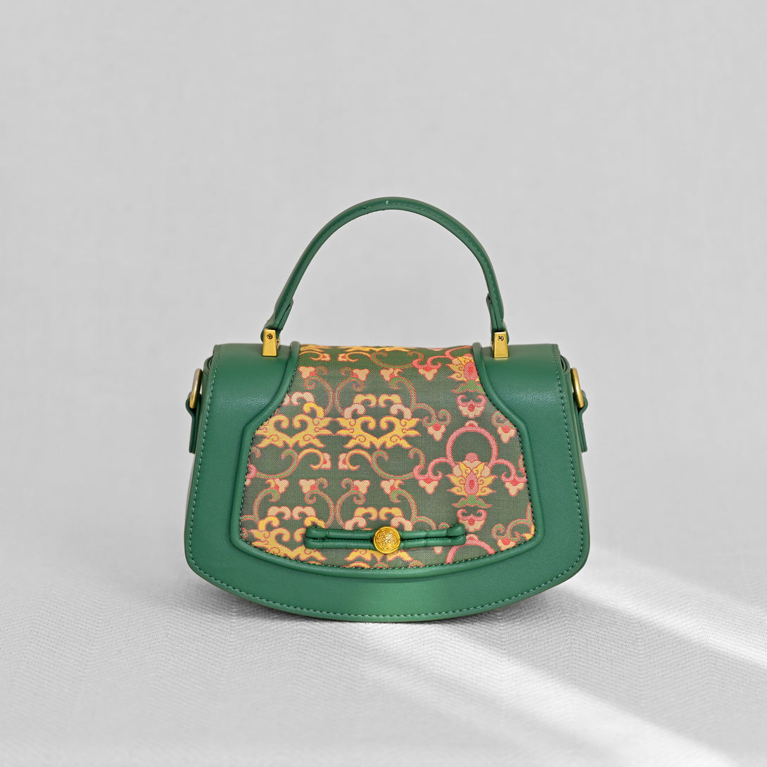 Captures the poetic essence of oriental motifs and Arabian refinement. Inspired by the lush tones of jade and the elegance of palace tapestries, this piece fuses cultural heritage with modern artistry. The silk brocade panel showcases intricate golden floral patterns — a symbol of harmony and renewal — while the deep emerald leather frame exudes timeless sophistication.